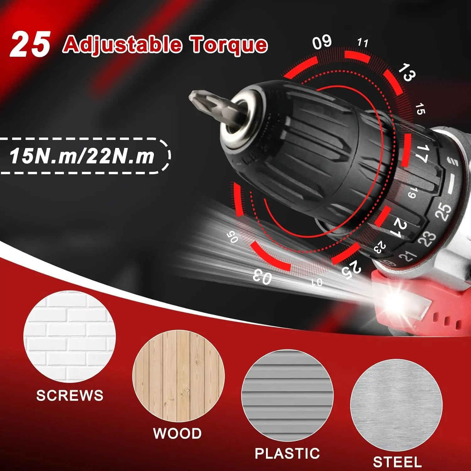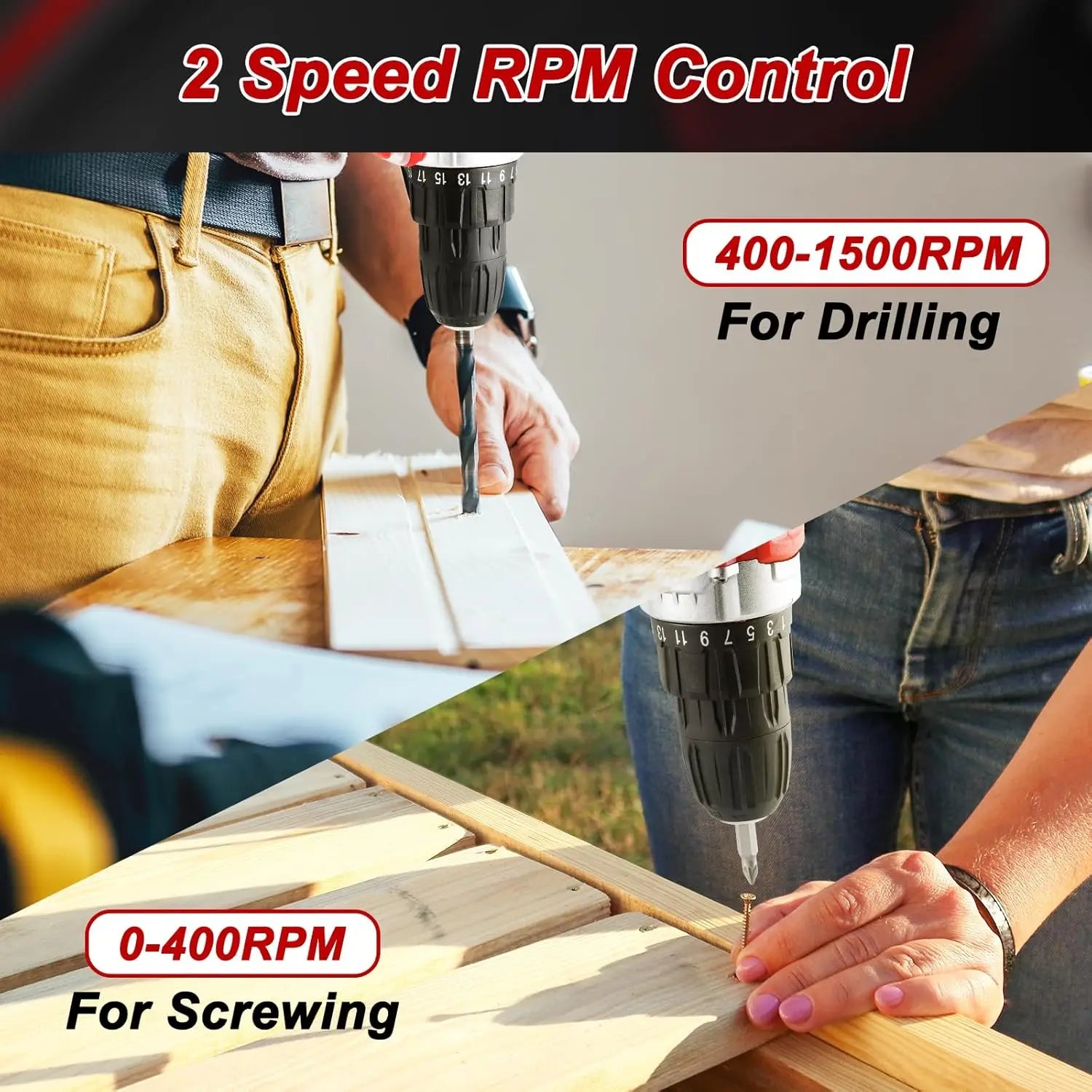 【High-Quality & Durable】This cordless drill/driver set is made of a robust alloy with a corrosion-resistant chrome plating. The ergonomic, non-slip handle fits comfortably in the hand. The compact and lightweight design ensures high stability, long service life, and reliable performance.