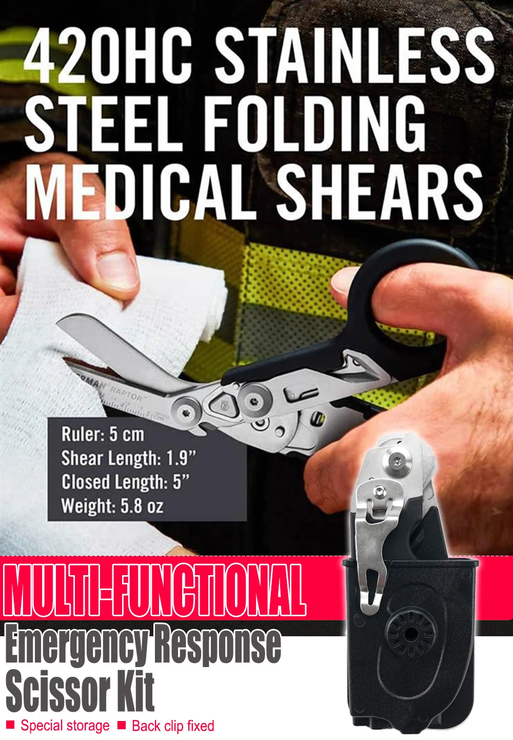 Raptor Emergency Response Shears Multifunctional Scissors with Strap Cutter and Glass Breaker with Compatible Holster