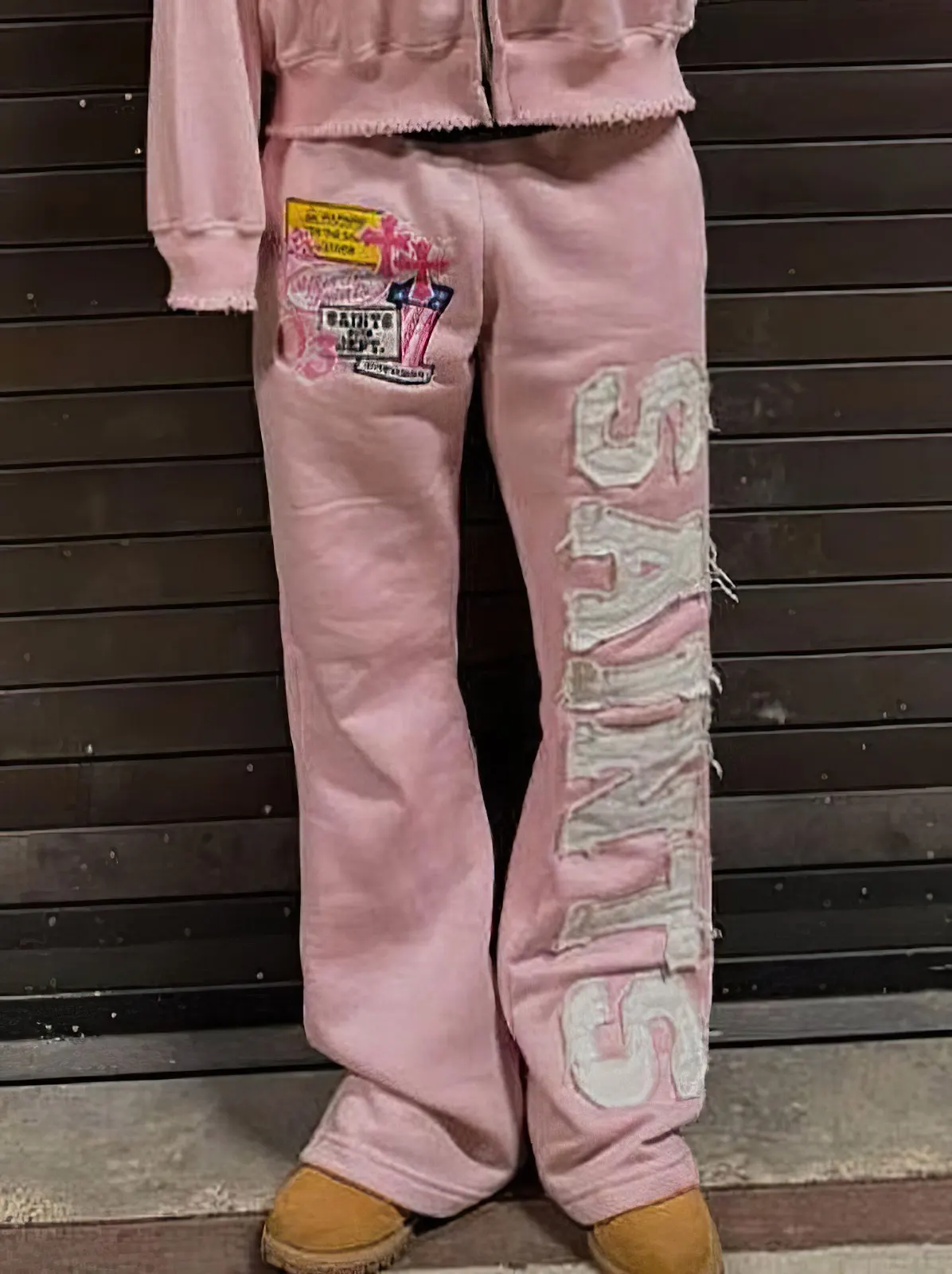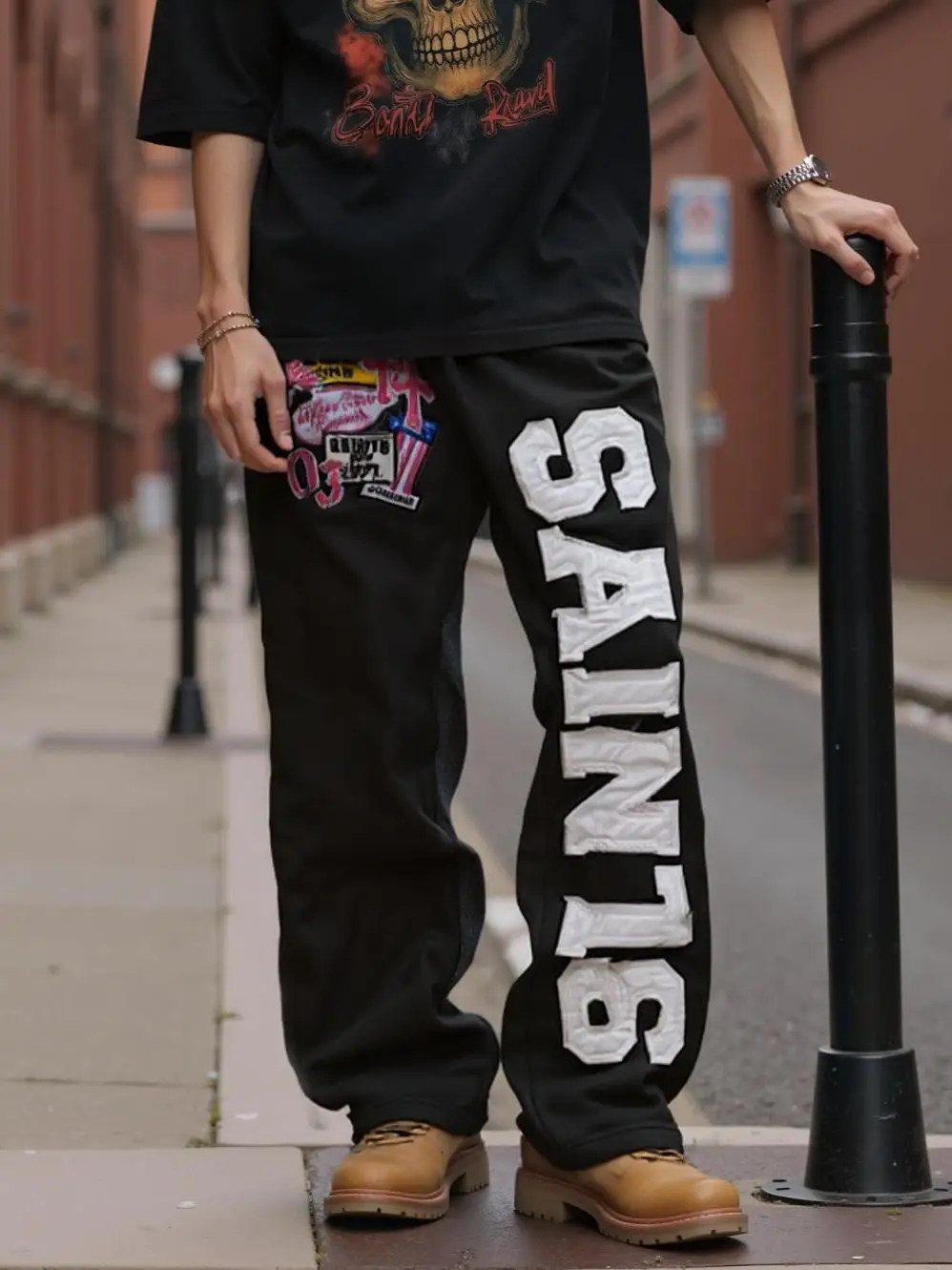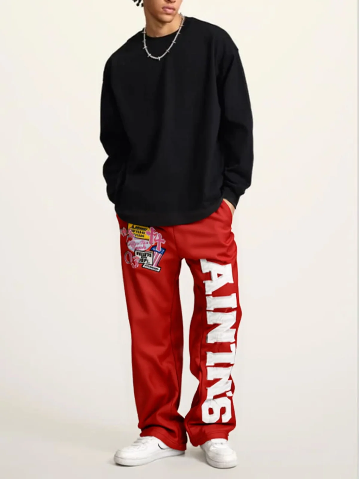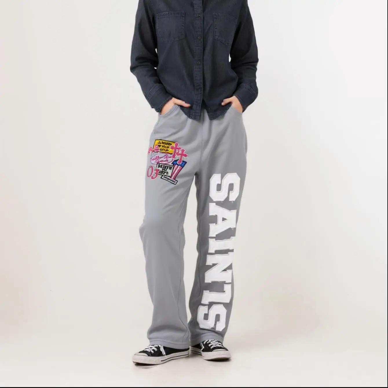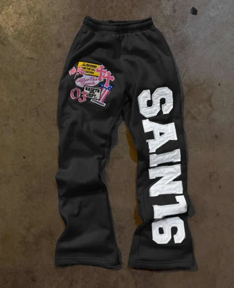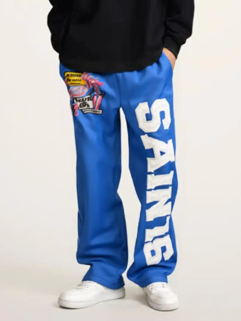 sporty sweatpants with embroidered logo patches and decals, loose and straight style