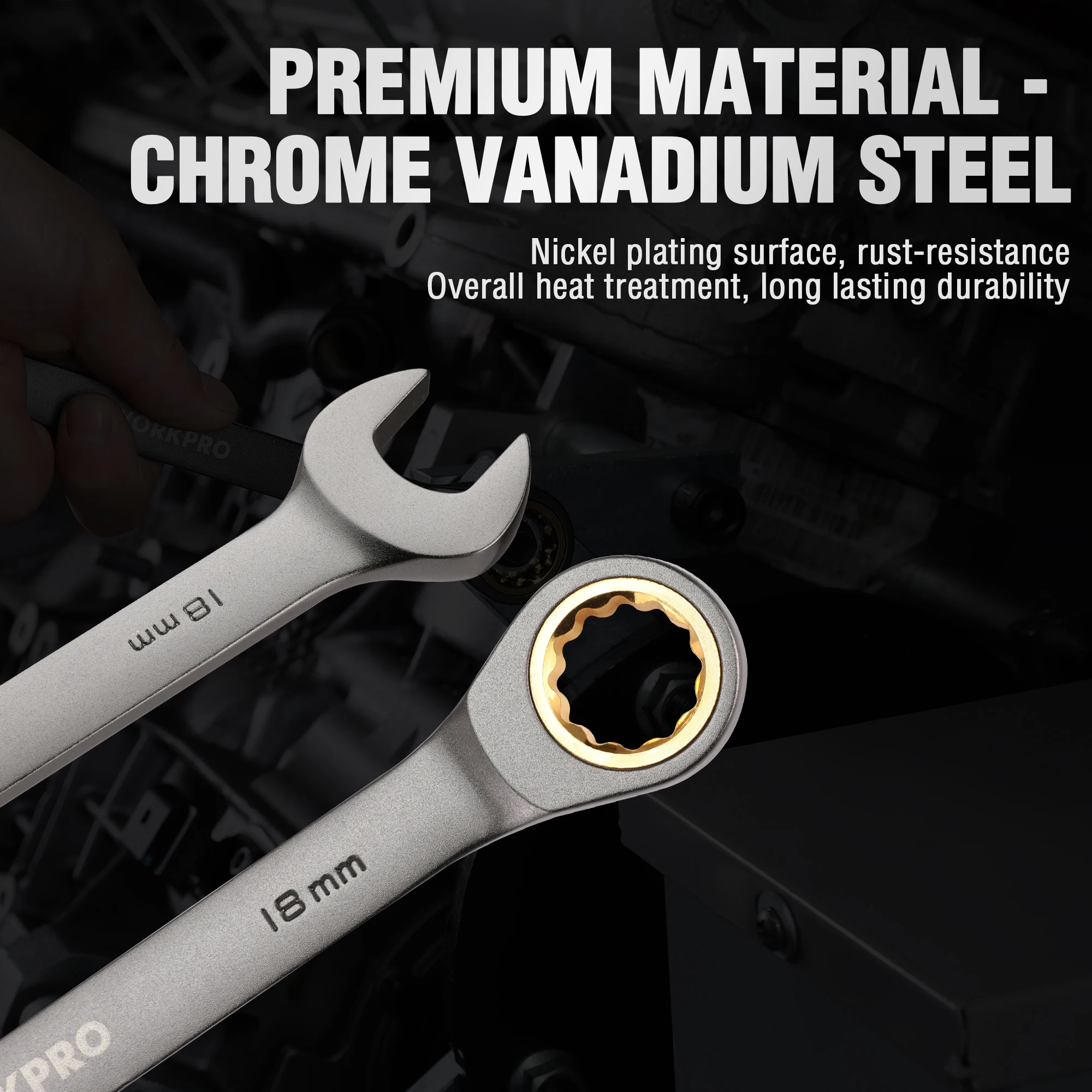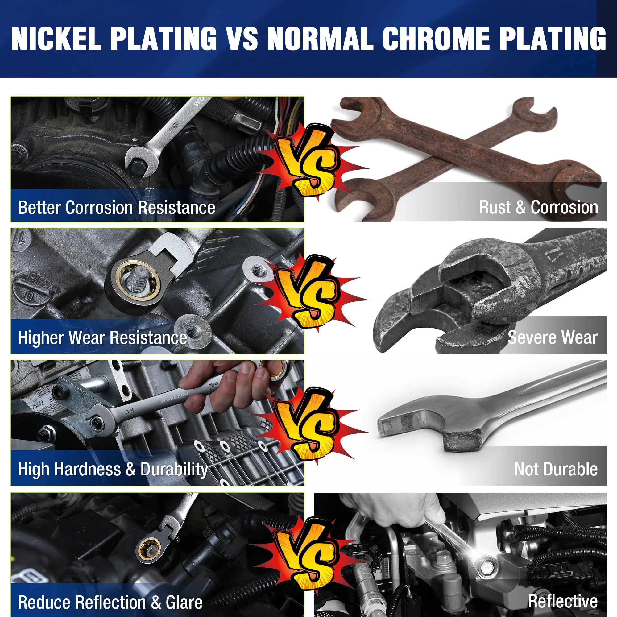 The ratchet wrenches set is made of high-quality chrome vanadium steel with mirror polish finish. Heat treated is for maximum strength, meanwhile, chrome plated achieves for better corrosion and rust resistance