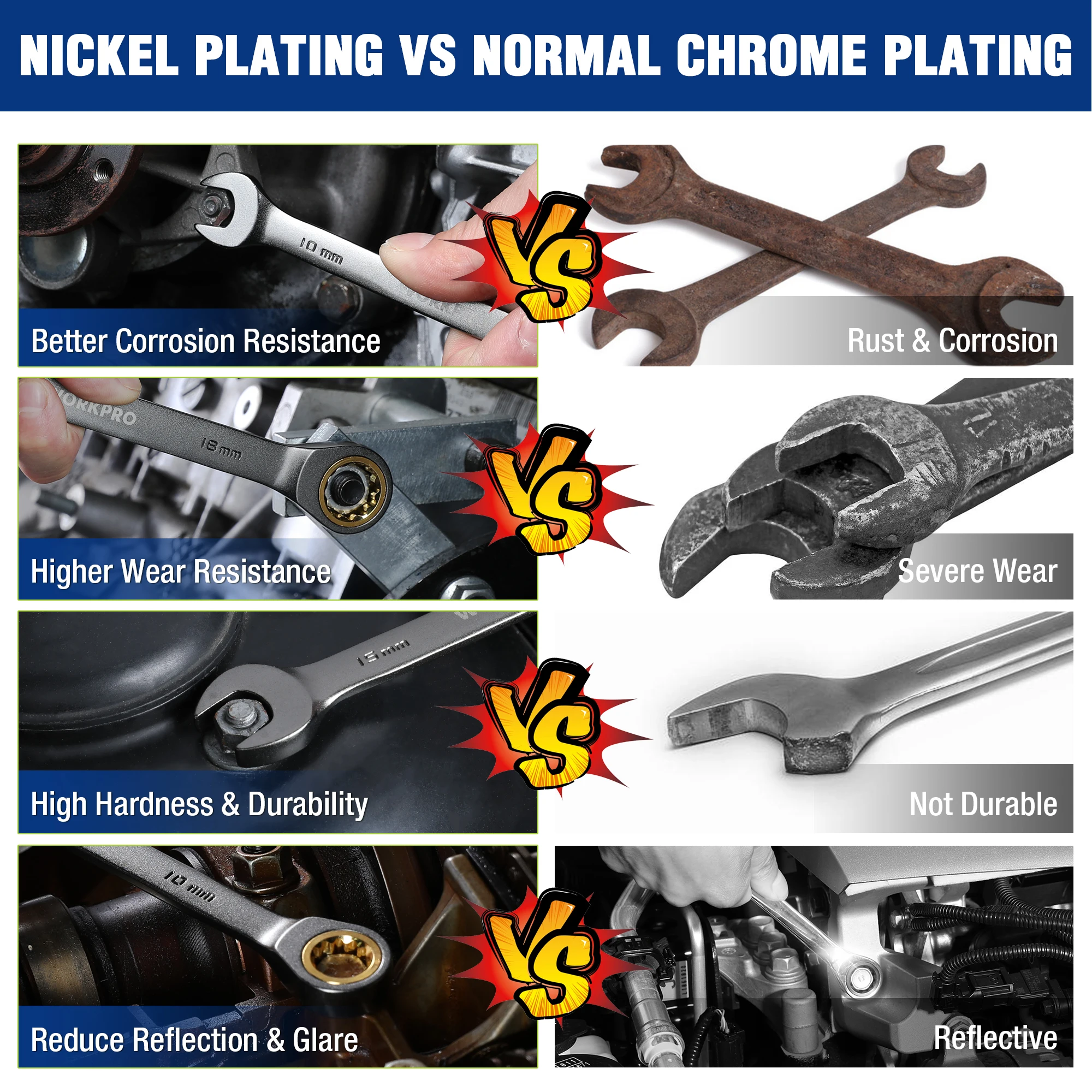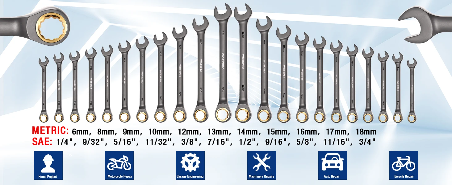 WORKPRO combination wrench sets have a wide range of application scenarios, including motorcycle repair, auto repair, home projects, bicycle repair, machinery repairs, garage engineering, and so on
